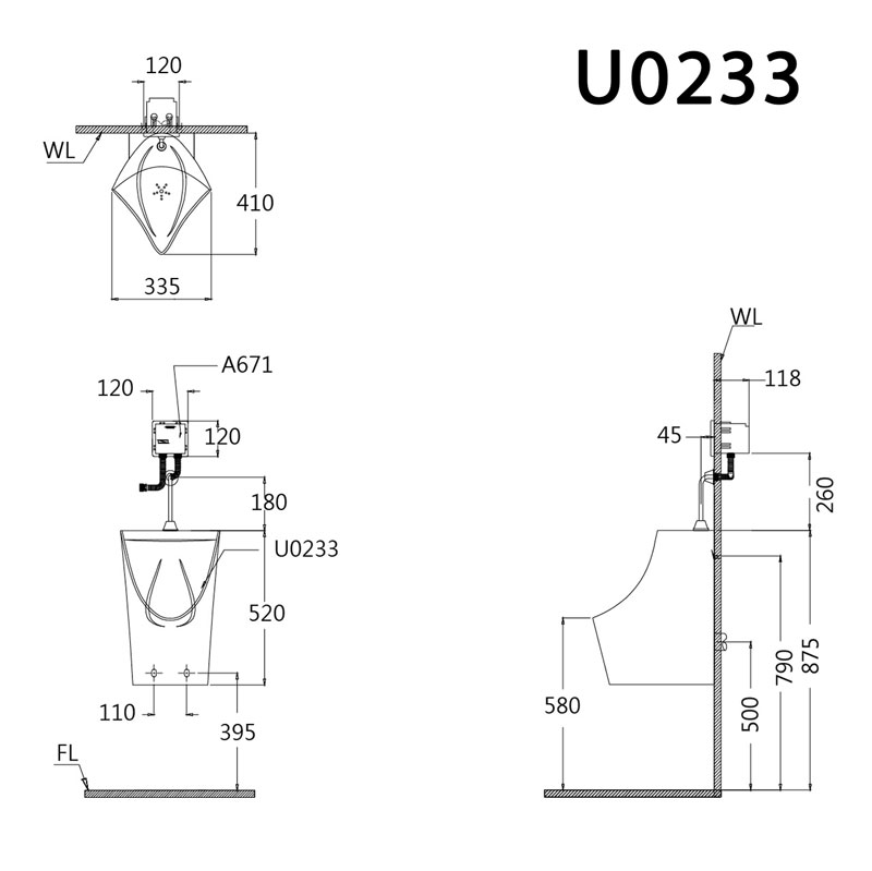 Bản vẽ kĩ thuật Bồn tiểu nam CAESAR U 0233 treo tường