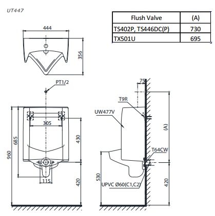 Bản vẽ kĩ thuật Bồn tiểu nam TOTO UT447S treo tường