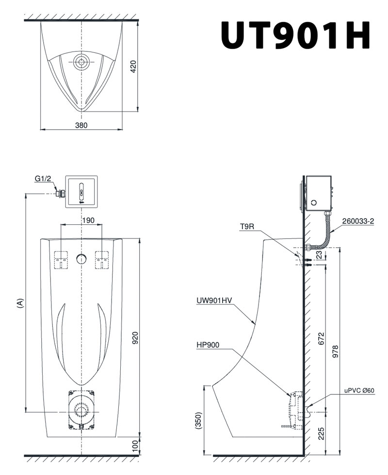 - Bao gồm: thân bồn tiểu UW901HV, bích nối HP900, dây cấp 260033-2, móc treo T9R