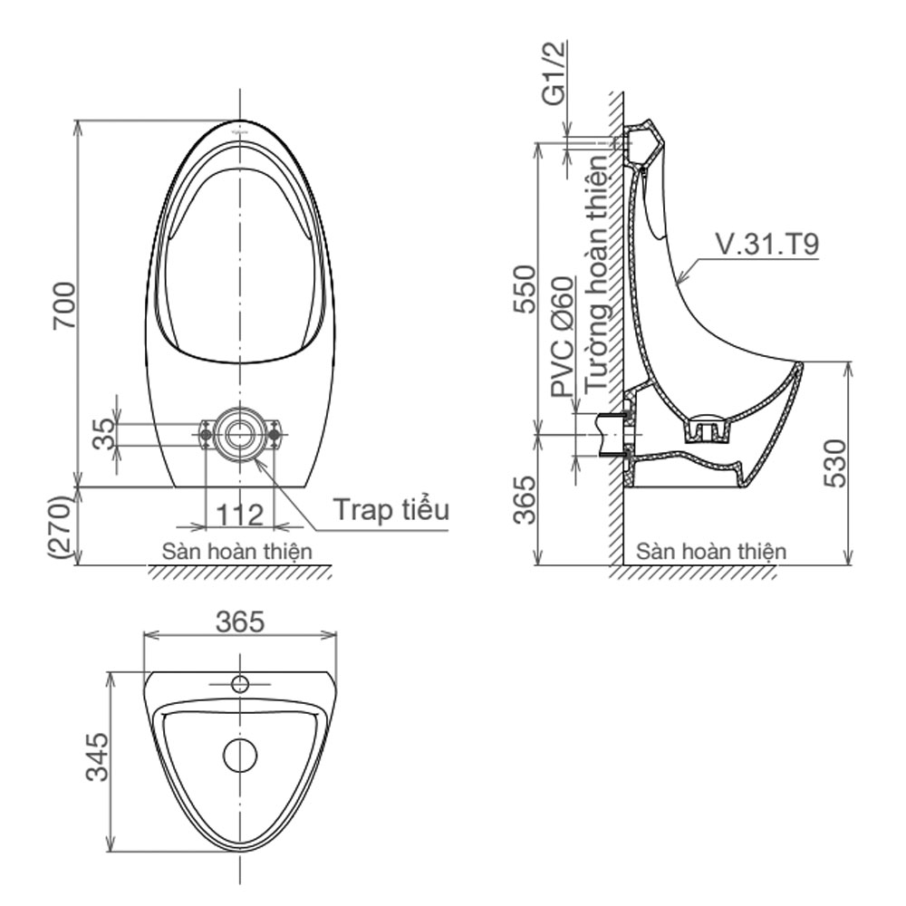 Bản vẽ kĩ thuật Bồn tiểu nam VIGLACERA T9 treo tường