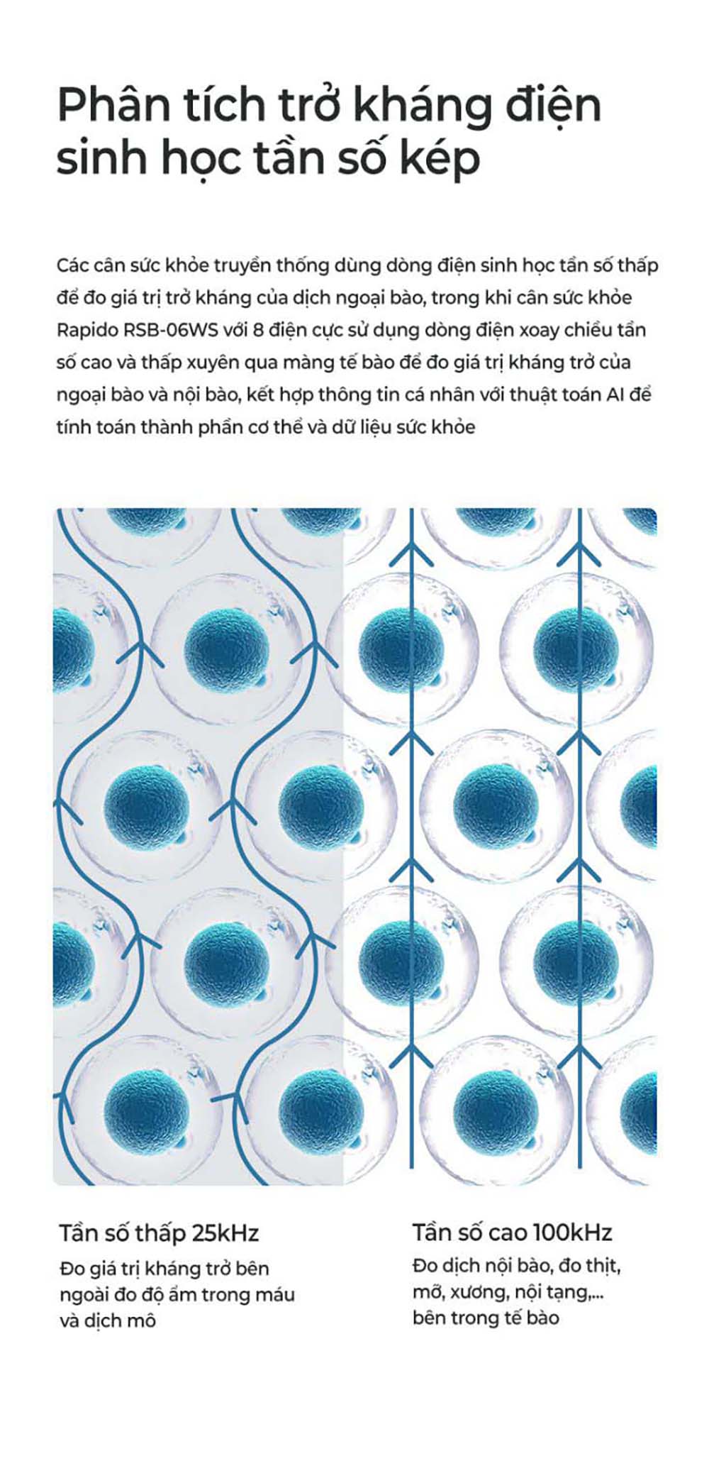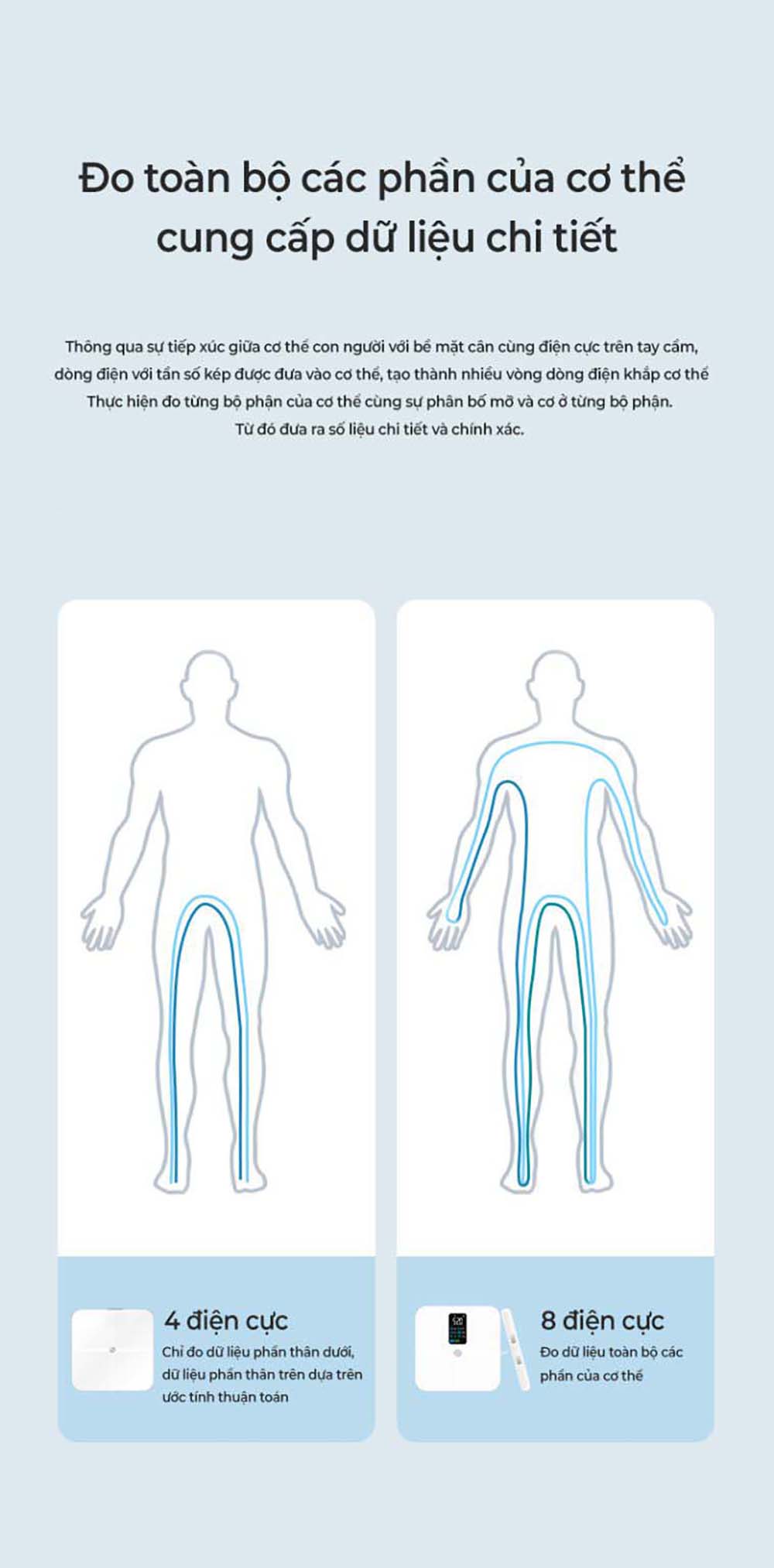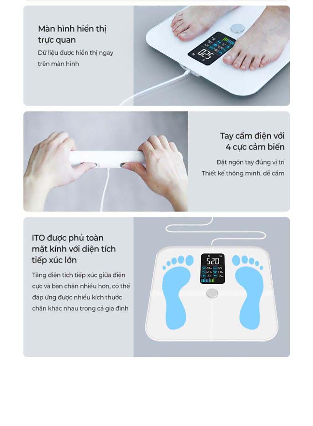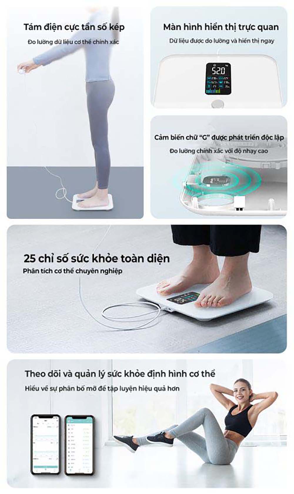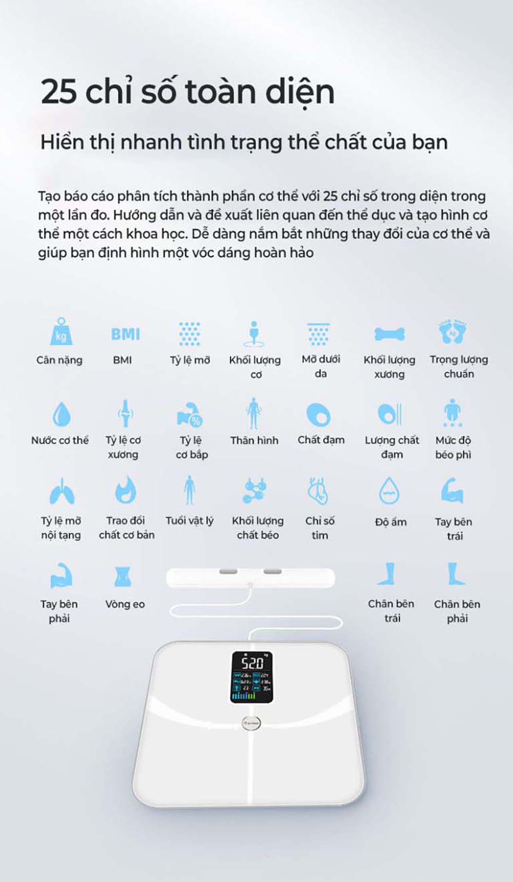 - Với công nghệ đo BIA tần số kép 8 điện cực, cân này có khả năng đo chính xác 25 chỉ số cơ thể khác nhau.