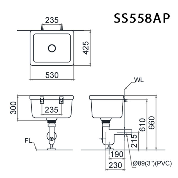 Bản vẽ kỹ thuật Chậu giặt CAESAR SS 558AP xả tường