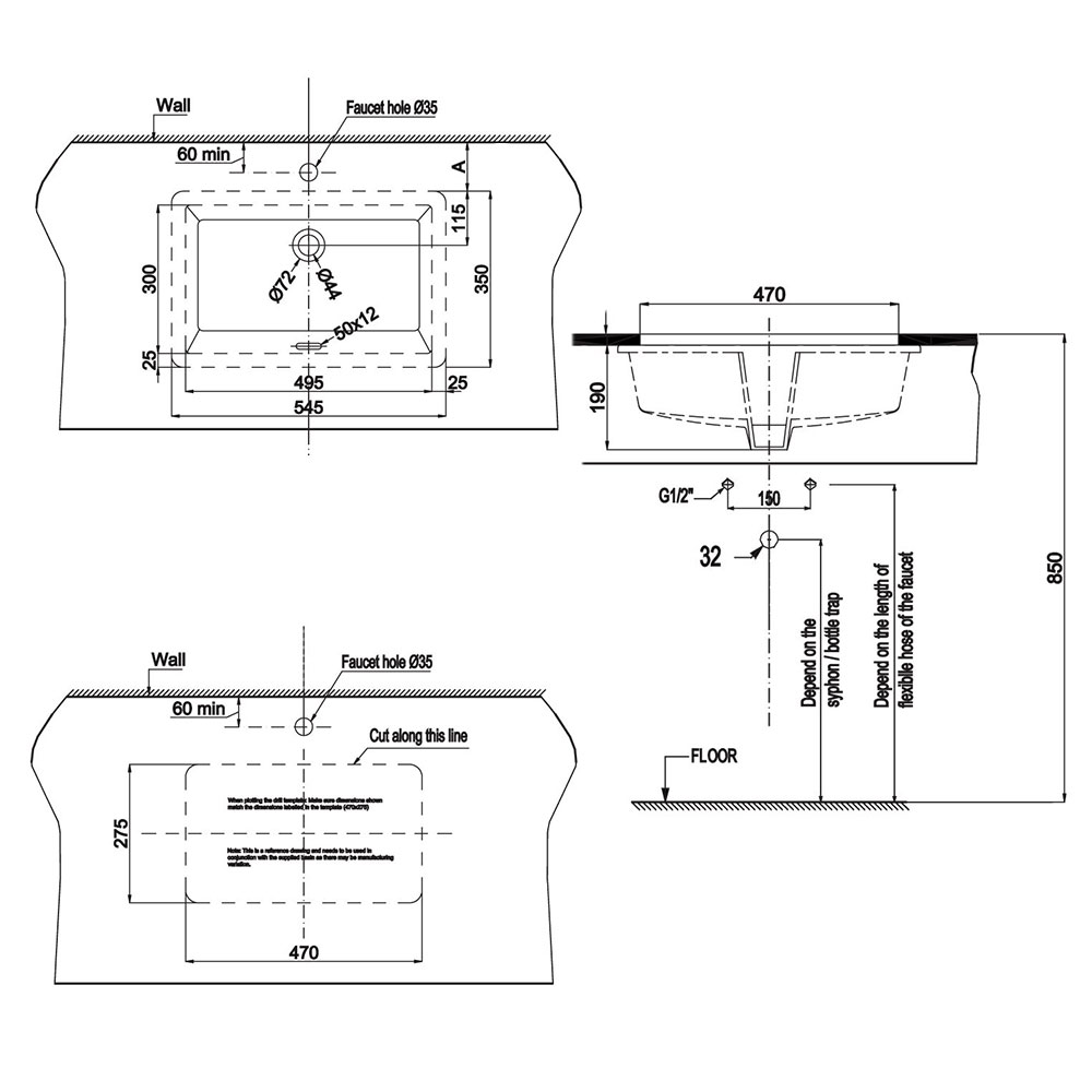 Bản vẽ kích thước chậu lavabo HAFELE Sapporo 545 588.79.014 âm bàn .