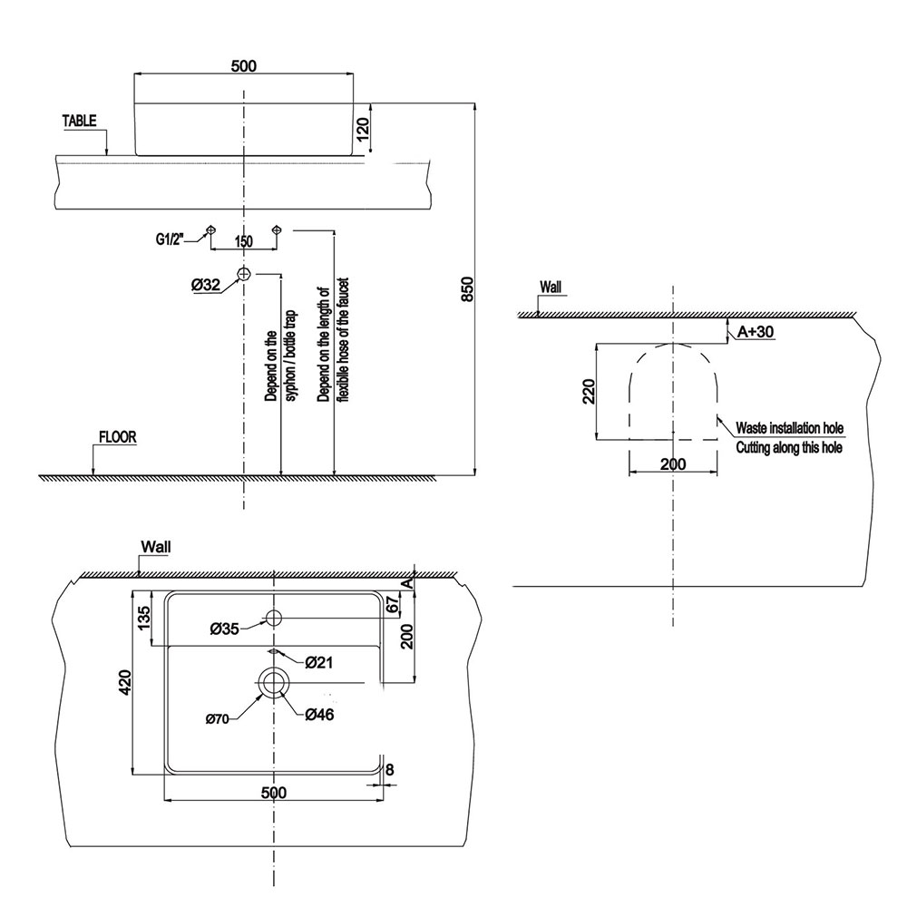 Bản vẽ kích thước chậu lavabo HAFELE Sapporo 500 588.79.032 đặt bàn .