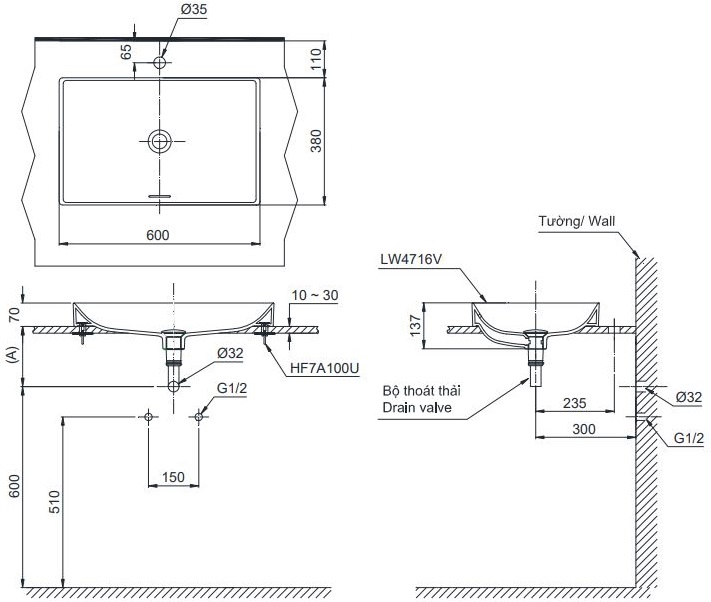 - Bao gồm: thân chậu LW4716V, vít cố định HF7A100U, bộ thoát thải VM5D419V