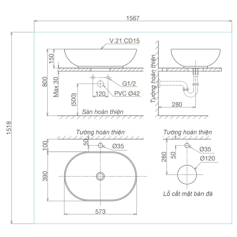 Bản vẽ kĩ thuật chậu lavabo VIGLACERA CD 15 đặt bàn