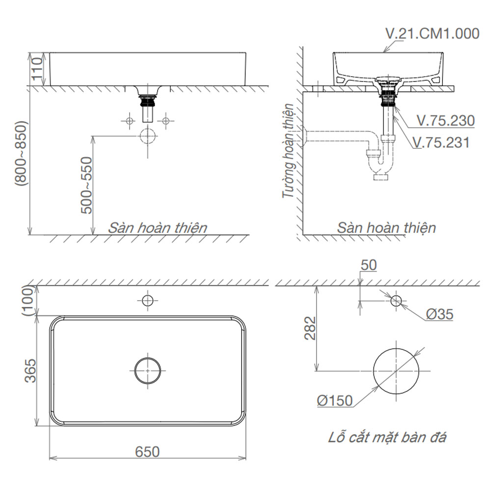 Thông số kĩ thuật chậu lavabo VIGLACERA CM1 CM01 đặt bàn