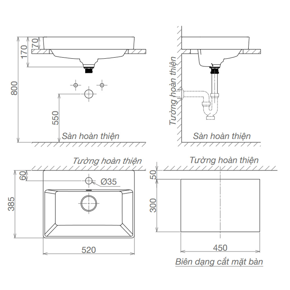 Bản vẽ kĩ thuật chậu lavabo VIGLACERA V 29 đặt bàn