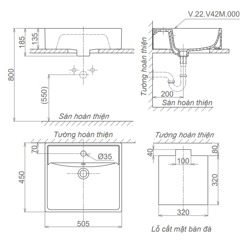 Bản vẽ kĩ thuật chậu lavabo VIGLACERA V 42M đặt bàn