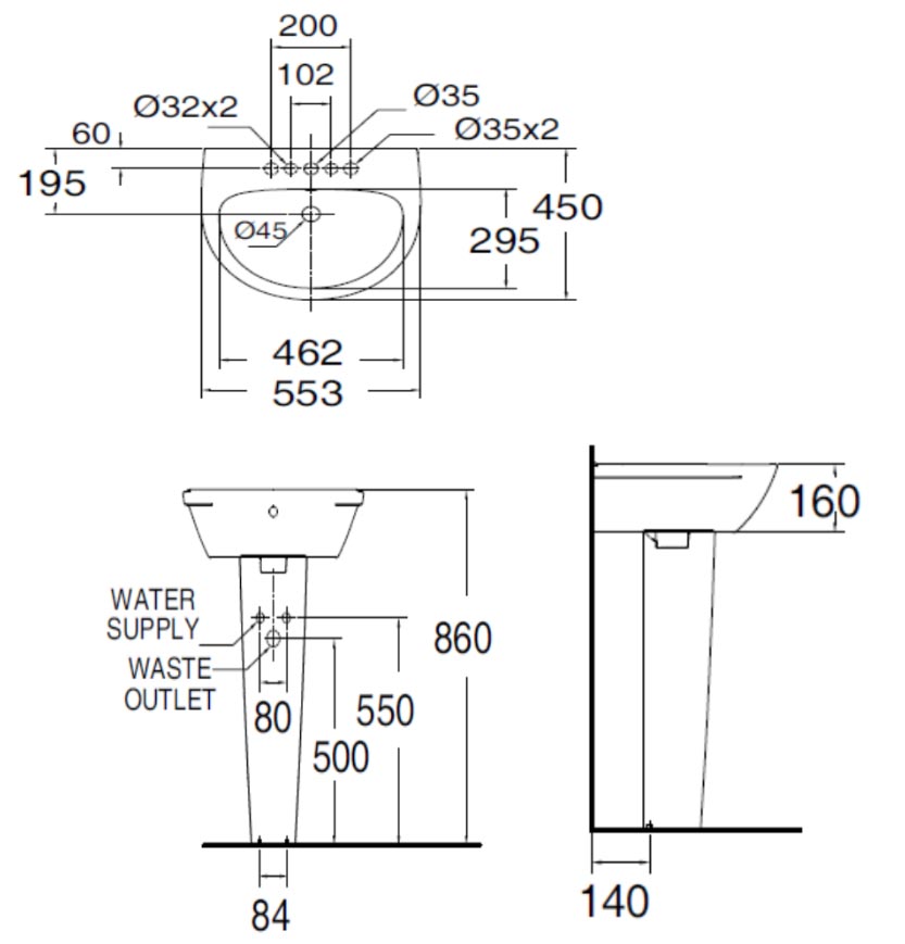 Bản vẽ kĩ thuật chậu lavabo American Standard 0953-WT WP-F711 Neo Modern chân dài treo tường