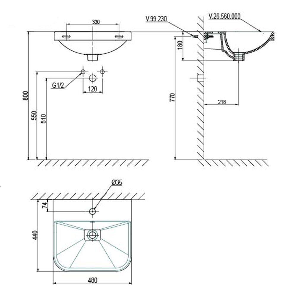 Bản vẽ kĩ thuật chậu lavabo VIGLACERA V.26.560 treo tường