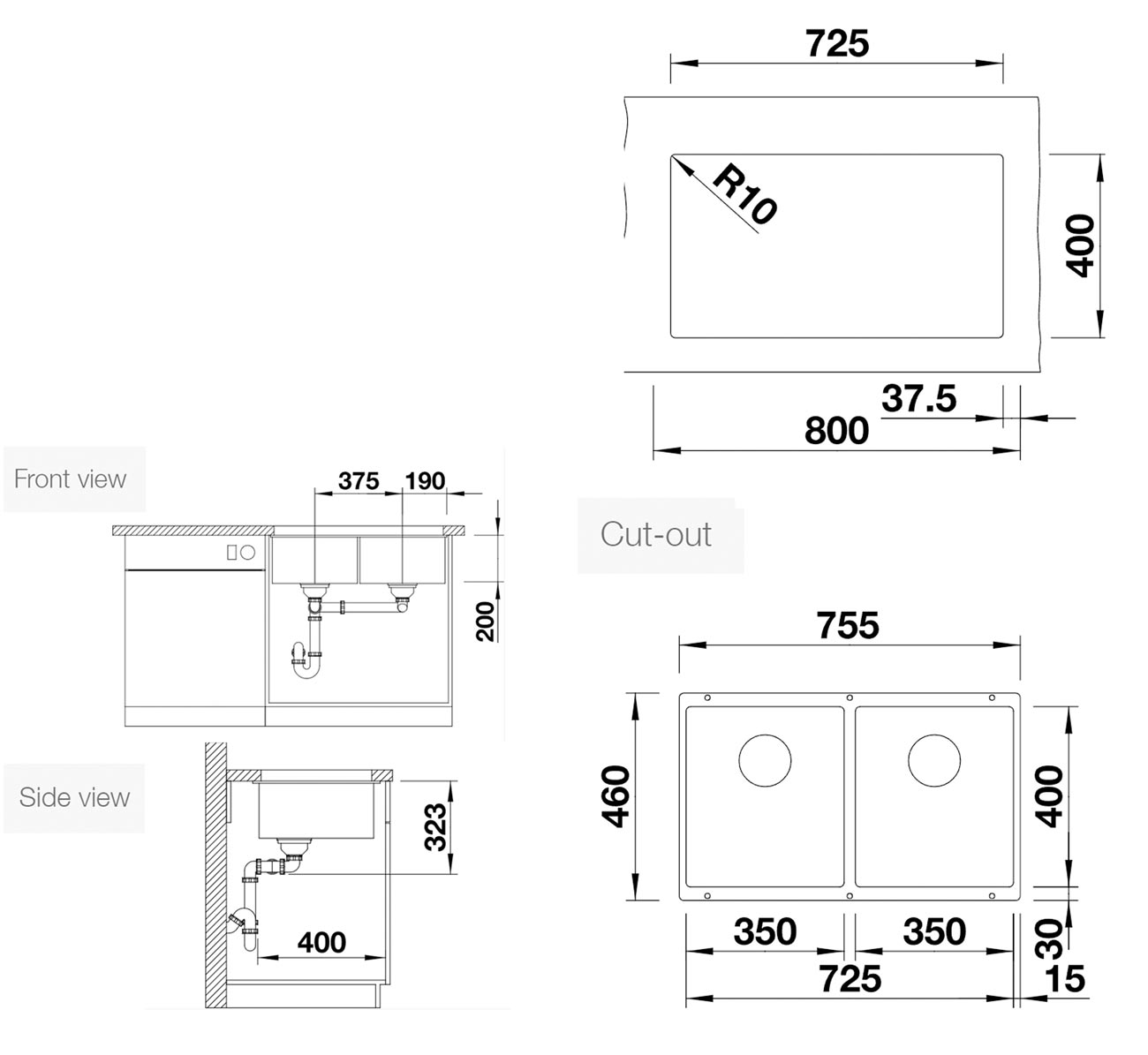 Bản Vẽ Kỹ Thuật Chậu rửa bát đá BLANCO SUBLINE 350/350-U Anthracite