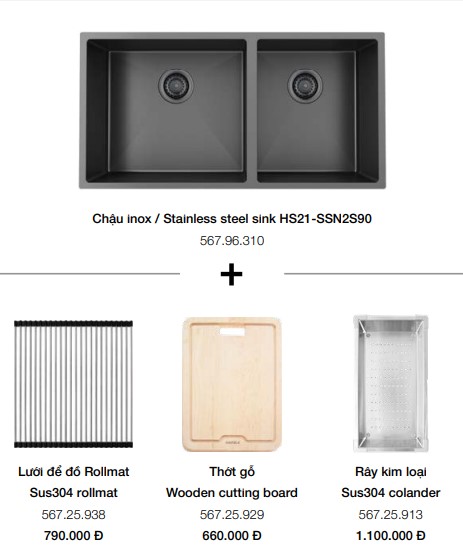 - Phụ kiện: Siphon, Lưới để đồ Rollmat 567.25.938, thớt gỗ 567.25.929, rổ inox 567.25.913