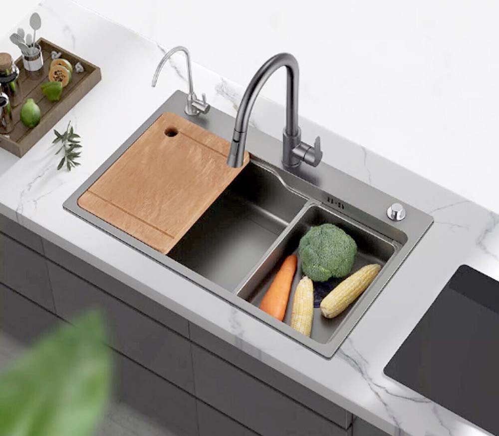 - Dòng chậu hạ bậc tích hợp công năng: Chậu này tích hợp chức năng của chậu rửa nhỏ và thớt gỗ, tiết kiệm không gian và tạo sự tiện lợi trong việc sử dụng.