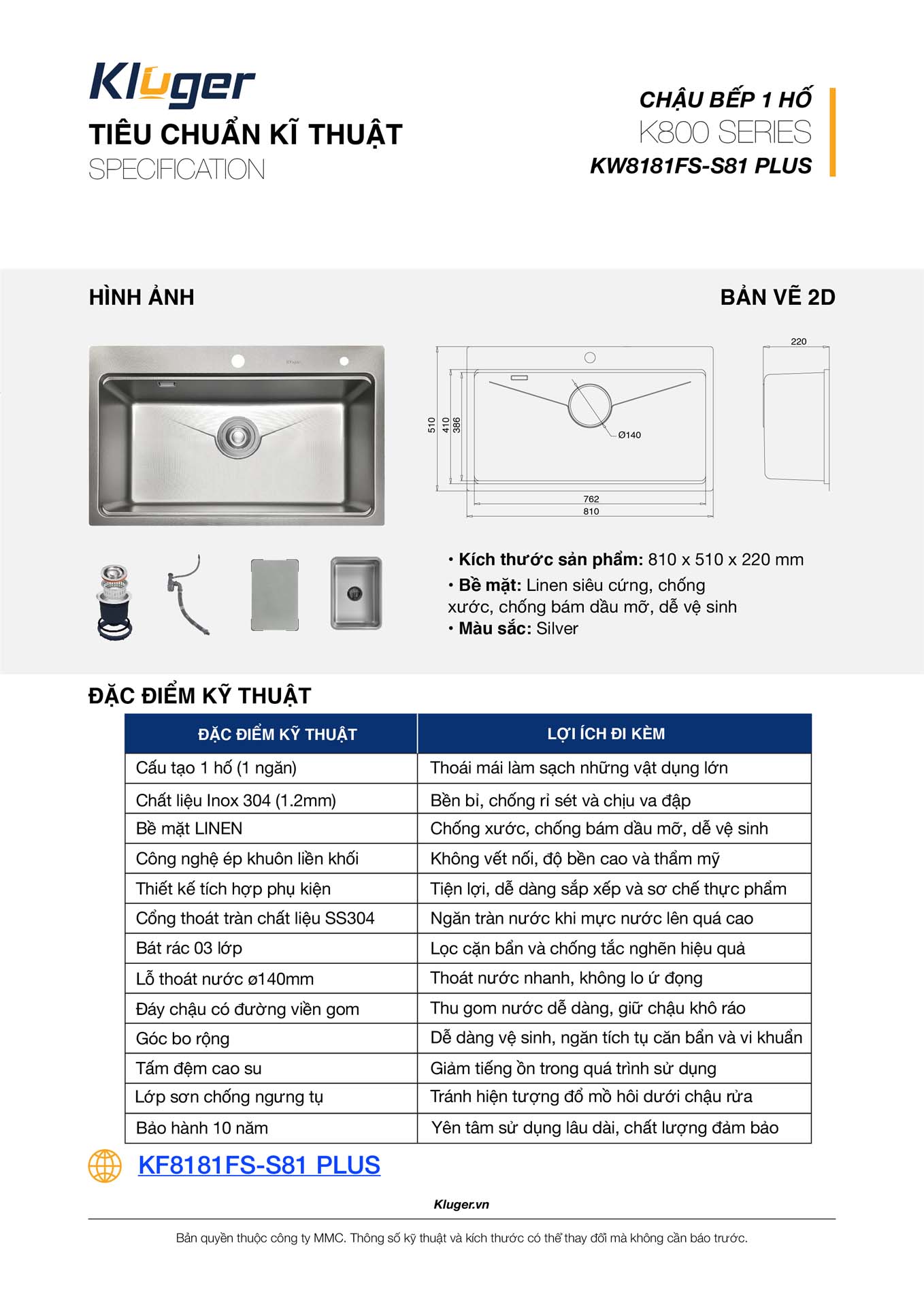 Chậu rửa bát inox KLUGER KW8181FS Plus dòng K800