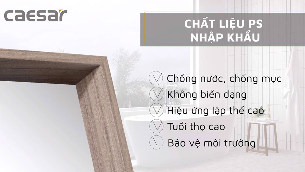 - Viền chất liệu nhựa PS nhập khẩu: Viền gương được làm từ chất liệu nhựa PS nhập khẩu, mang lại độ bền cao và khả năng chống thấm nước, cong vênh, mối mọt. Điều này đảm bảo rằng gương sẽ giữ được hình dáng và độ bền lâu dài trong môi trường ẩm ướt của phòng tắm.