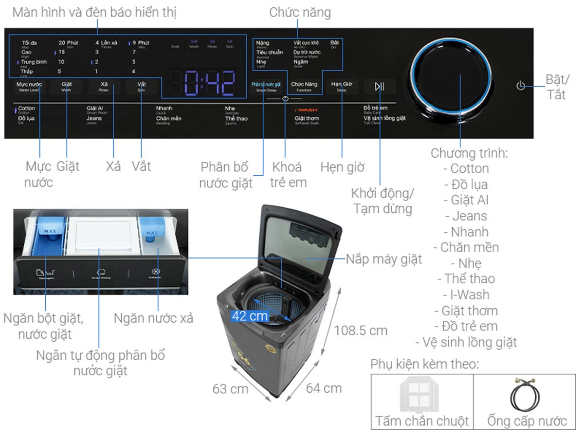 | Cách điều khiển | Song ngữ Anh – Việt có núm xoay, nút nhấn và màn hình hiển thị |