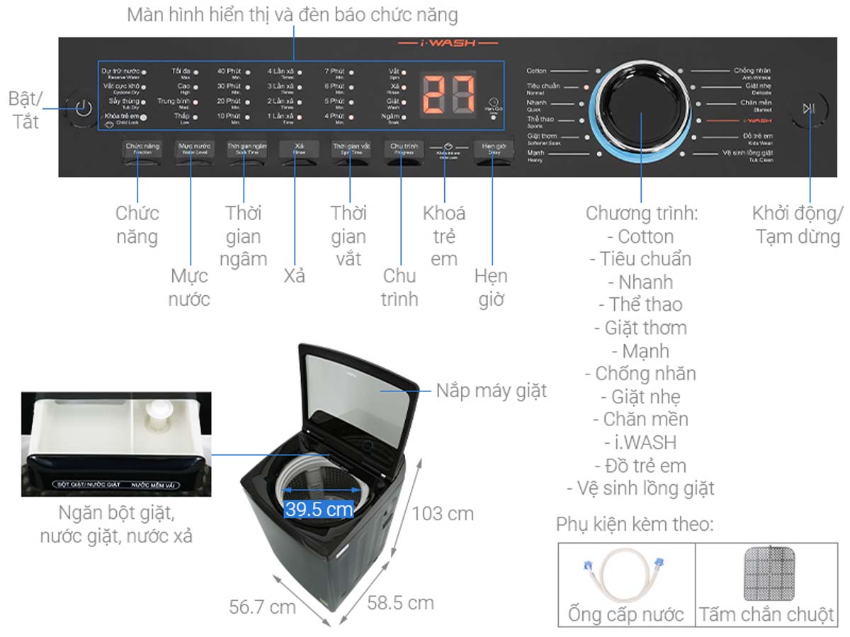 | Bảng điều khiển | Song ngữ Anh – Việt có nút xoay, nút nhấn và màn hình hiển thị |