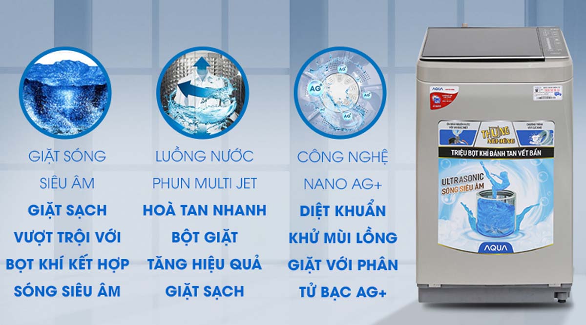 Máy giặt Aqua AQW-U850BT sử dung công nghệ giặt sóng siêu âm tạo ra hàng triệu bọt khí nhỏ trong quá trình giặt. Những bọt khí này vỡ ra tạo thành luồng sóng siêu âm mạnh mẽ, giúp đánh tan bột giặt nhanh chóng và thẩm thấu sâu vào từng sợi vải. Điều này không chỉ nâng cao hiệu quả giặt sạch mà còn tiết kiệm bột giặt và bảo vệ sợi vải khỏi hư tổn.
