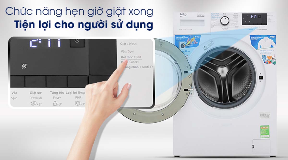 Beko WCV10612XB0ST có chức năng hẹn giờ giặt linh hoạt, cho phép người dùng cài đặt thời gian máy bắt đầu hoạt động. Nhờ đó, bạn có thể chủ động sắp xếp thời gian phù hợp với lịch sinh hoạt hoặc giặt vào giờ thấp điểm để tiết kiệm điện.Tinh nang May giat Beko WCV10612XB0ST 10kg Inverter 1