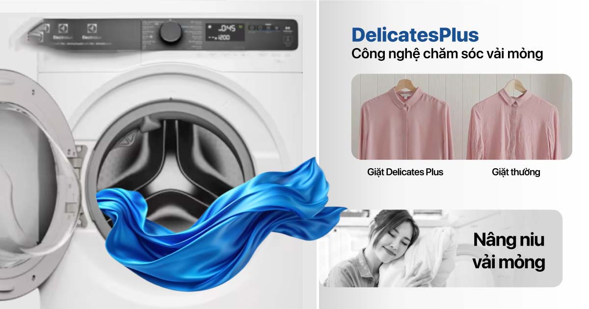 Công nghệ DelicatesPlus cung cấp chế độ giặt nhẹ nhàng với mực nước tối ưu, bảo vệ các loại vải mỏng manh như cotton cao cấp, giúp kéo dài tuổi thọ cho quần áo yêu thích của bạn.
