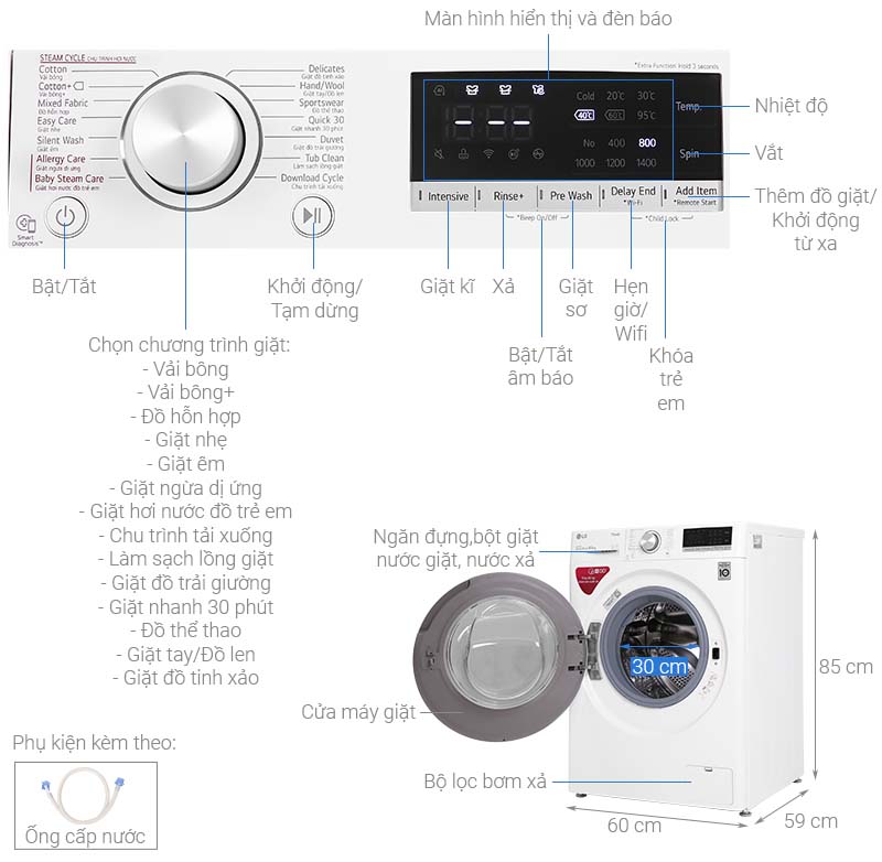 - Chương trình giặt: 14 chương trình, bao gồm Giặt nhanh 30 phút, Giặt ngừa dị ứng, Giặt hơi nước, Giặt đồ len, Giặt êm, Giặt chăn ga, Giặt nhẹ, Vải bông