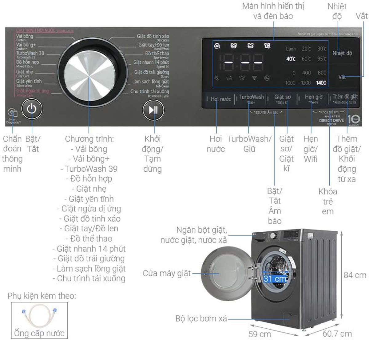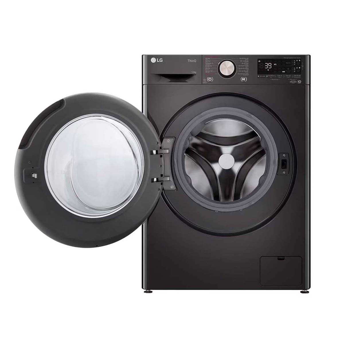 - Tiện ích: Thêm đồ trong khi giặt (Add Item), Khóa trẻ em, Hẹn giờ giặt, Chẩn đoán lỗi Smart Diagnosis, Tự khởi động lại khi có điện, Điều khiển từ xa qua ứng dụng LG ThinQ