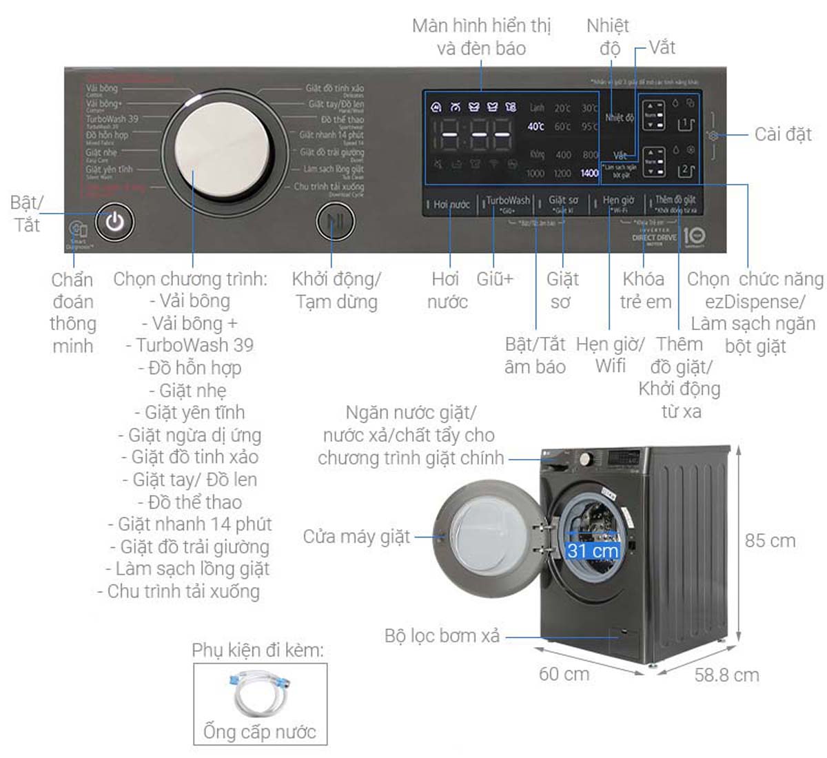 - Tiện ích: Thêm đồ trong khi giặt (Add Item), Khóa trẻ em, Giặt nước nóng, Giặt hơi nước, Điều khiển từ xa qua ứng dụng LG ThinQ, Kết nối Wi-Fi, Tự động phân bổ nước giặt với hệ thống ezDispense™, Chẩn đoán lỗi Smart Diagnosis
