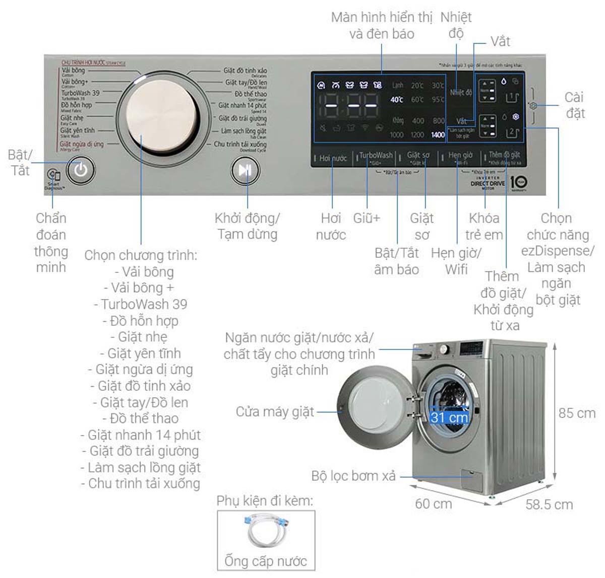 - Tiện ích: Thêm đồ trong khi giặt, Khóa trẻ em, Hẹn giờ giặt, Giặt hơi nước (Steam+™), Tự động phân bổ nước giặt với hệ thống ezDispense™, Điều khiển từ xa qua ứng dụng LG ThinQ™, Kết nối Wi-Fi, Chẩn đoán lỗi thông minh (Smart Diagnosis™)