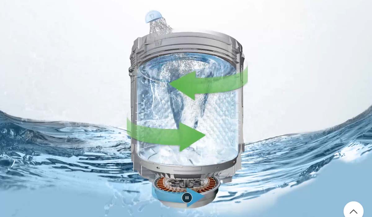 Công nghệ TurboDrum™ cho phép mâm giặt và lồng giặt xoay ngược chiều nhau, tạo ra dòng nước xoáy mạnh mẽ, giúp loại bỏ hiệu quả các vết bẩn cứng đầu và giảm xoắn rối quần áo.