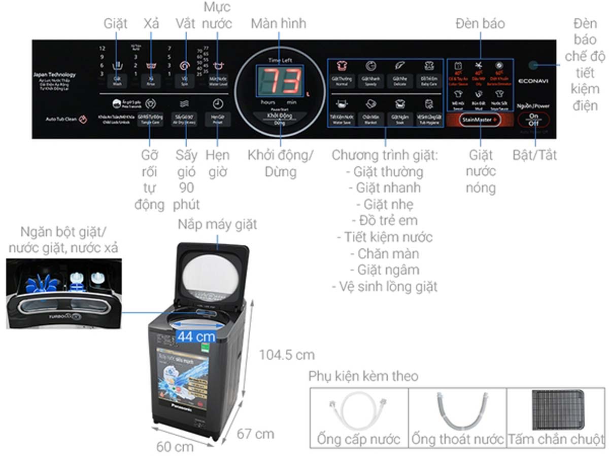 - Bảng điều khiển: Nút nhấn song ngữ Anh – Việt có màn hình hiển thị