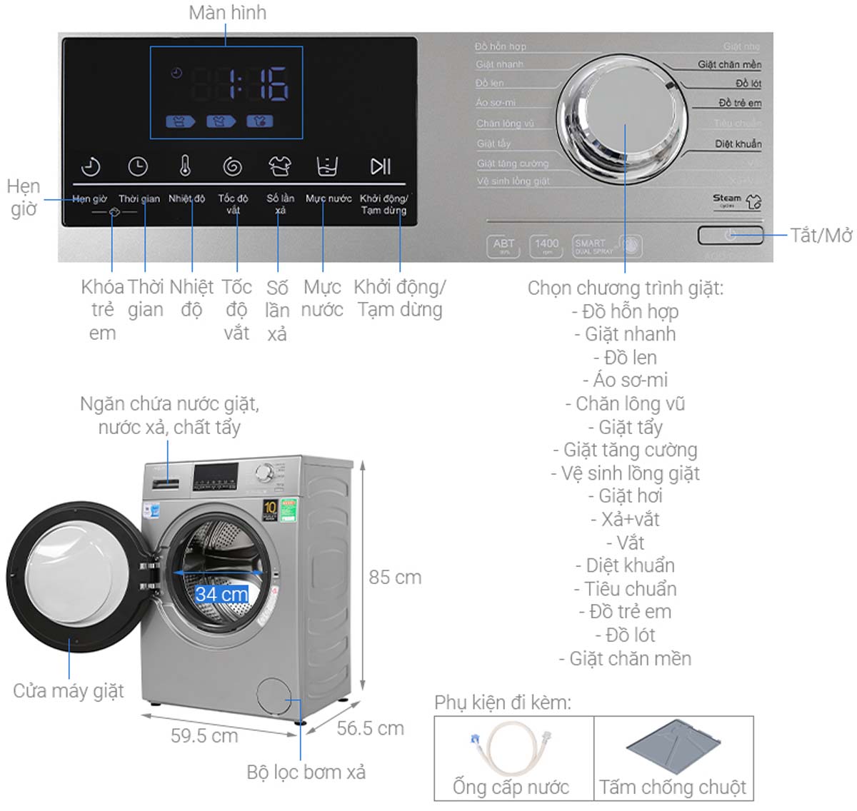 • Tiện ích: Màn hình hiển thị, núm vặn điều khiển, tự động phân bổ nước giặt và nước xả