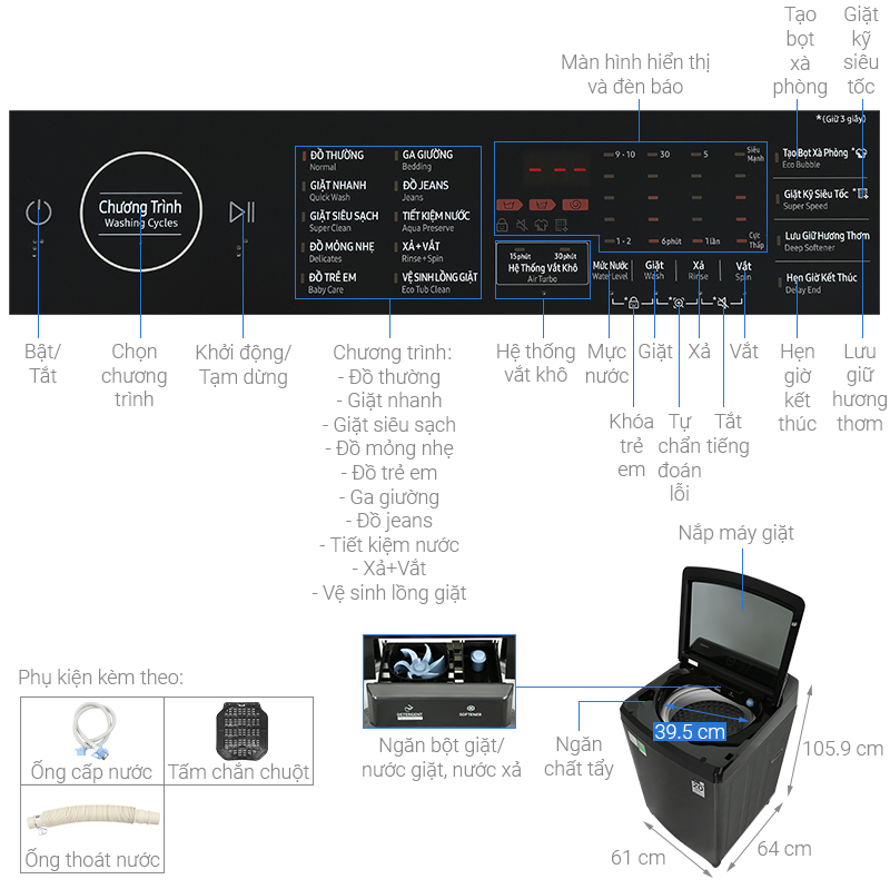• Tiện ích: Smart Check, Tự khởi động lại, Eco Tub Clean, Hẹn giờ giặt, Khóa trẻ em, Air Turbo, Cửa đóng êm