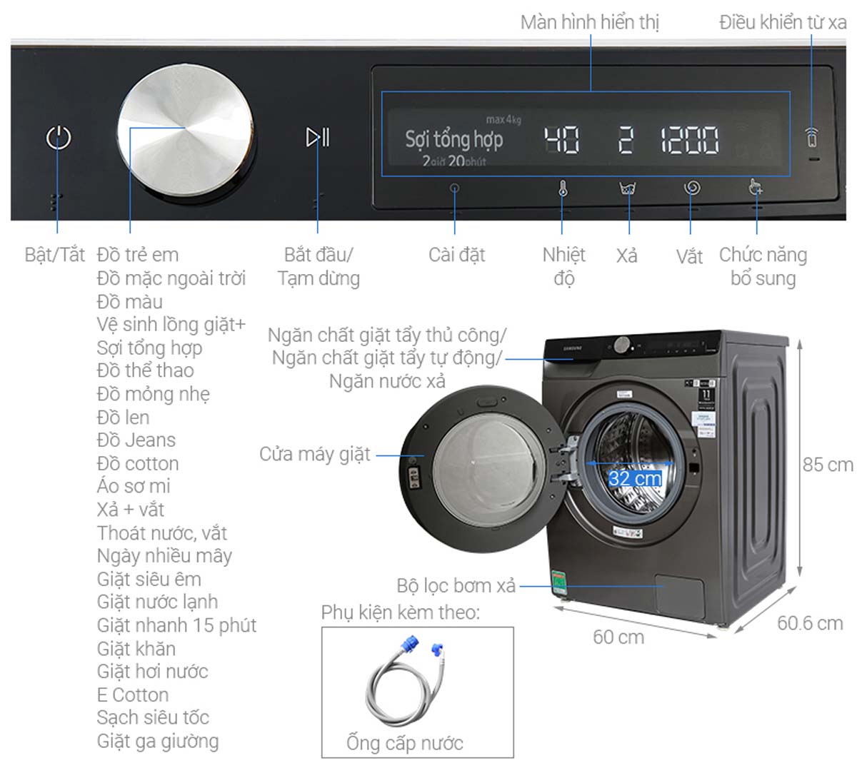 - Tiện ích: AI Control, SmartThings, Điều khiển từ xa qua Wi-Fi, Tự khởi động lại, Drum Clean+, Hẹn giờ giặt, Khóa trẻ em, Cửa đóng êm