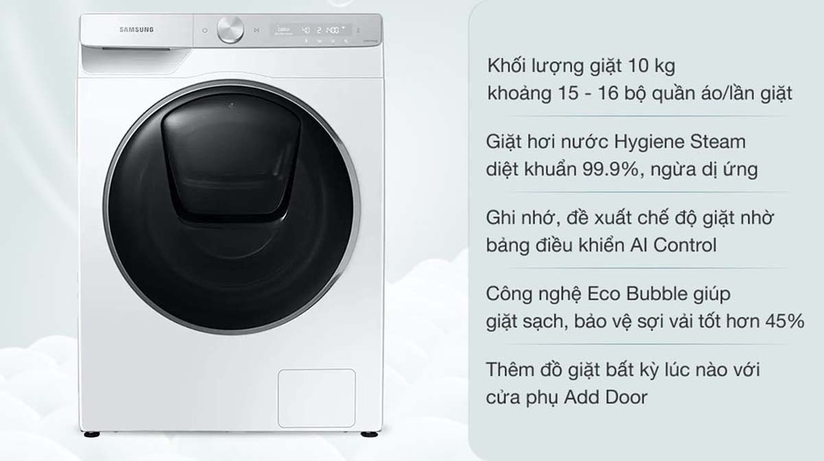 - Tiện ích: AI Control, SmartThings, Add Door, Drum Clean+, Hẹn giờ giặt, Khóa trẻ em, Cửa đóng êm, Wrinkle Care