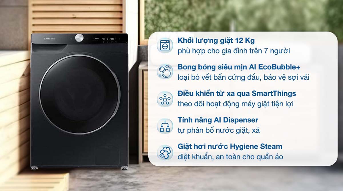 - Công nghệ giặt: AI Wash, EcoBubble, Hygiene Steam, QuickDrive, AI Dispenser, Bubble Soak, VRT Plus
