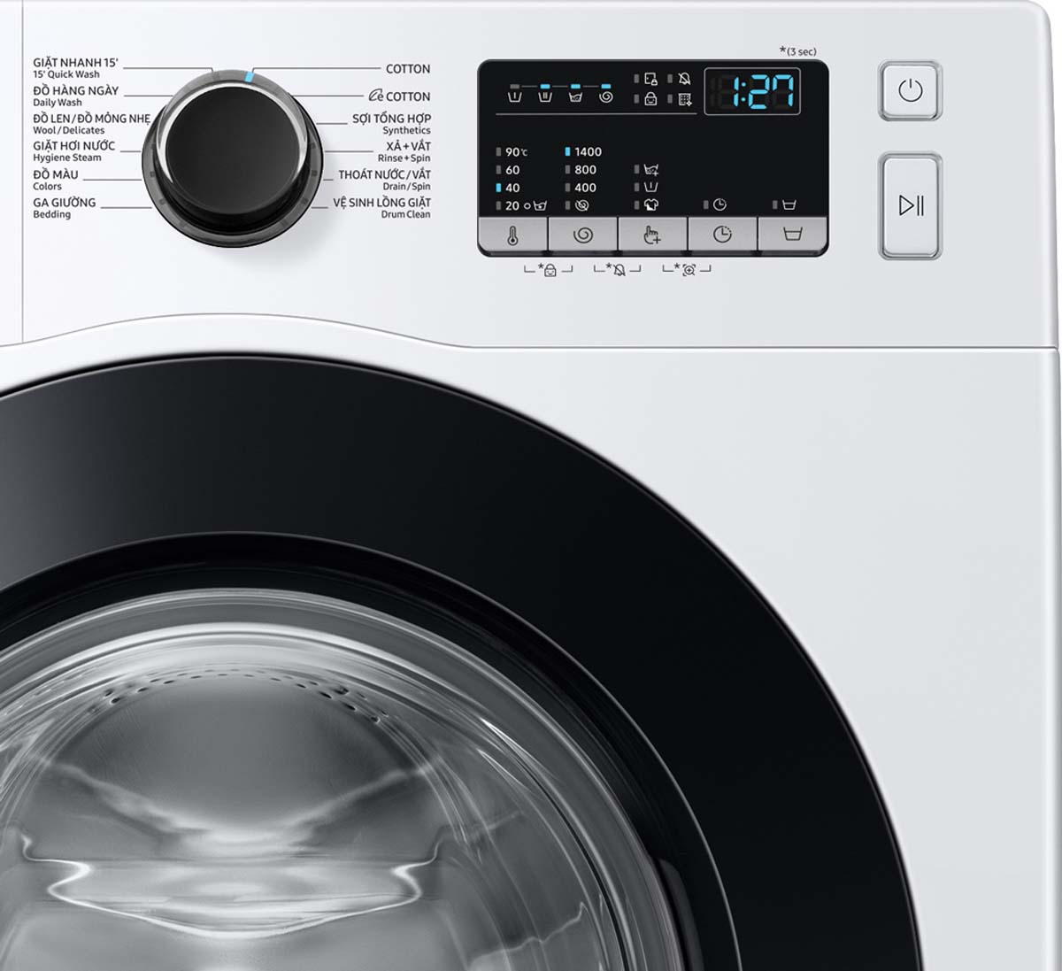 - Tiện ích: Smart Check, Drum Clean, Hẹn giờ giặt, Khóa trẻ em, Bảng điều khiển song ngữ Anh – Việt