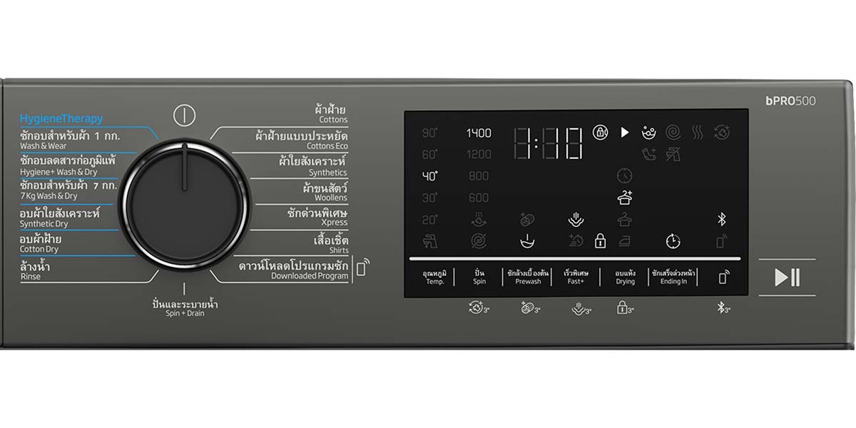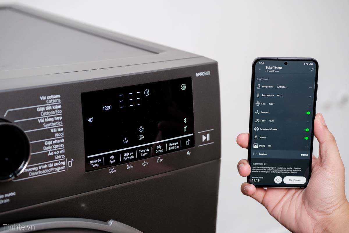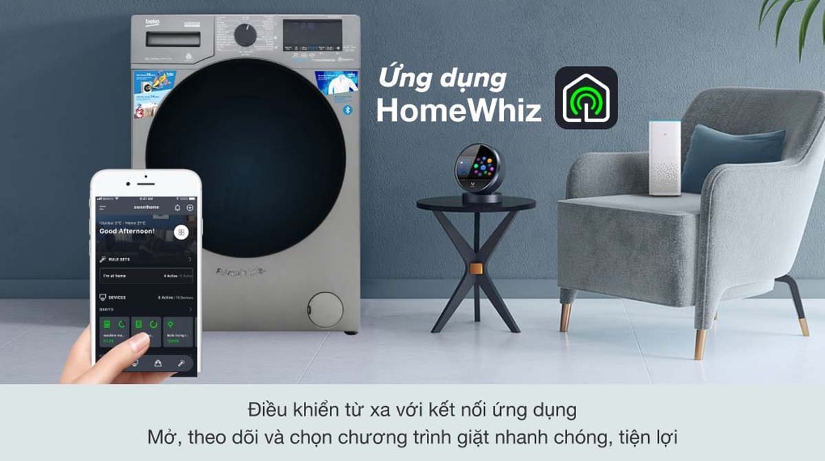 Máy hỗ trợ kết nối Bluetooth với ứng dụng HomeWhiz, giúp người dùng điều khiển, theo dõi và tải thêm chương trình giặt từ xa bằng smartphone tiện lợi.Tinh nang May giat Beko WCV9749XMST 9kg Inverter 6