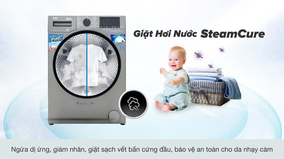 Máy Beko B3DFT5105472M tích hợp công nghệ SteamCure giúp phun hơi nước trước và sau chu trình giặt để làm mềm vải, giảm nhăn và loại bỏ vi khuẩn hiệu quả. Phù hợp với da nhạy cảm và trẻ nhỏ, đồng thời giảm công đoạn ủi sau khi giặt.Tinh nang May giat Beko WCV9749XMST 9kg Inverter 3