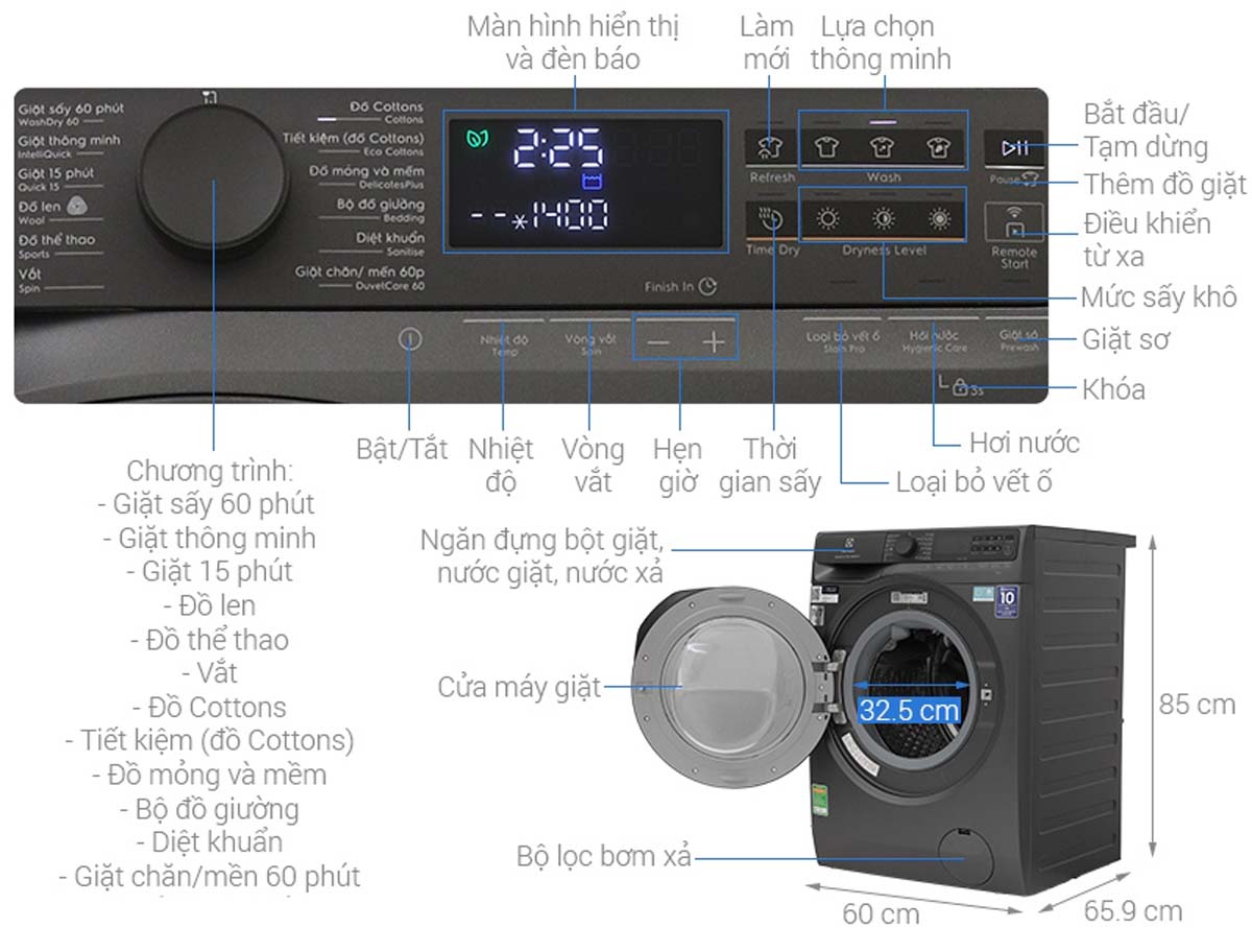- Chế độ giặt: 15 chương trình