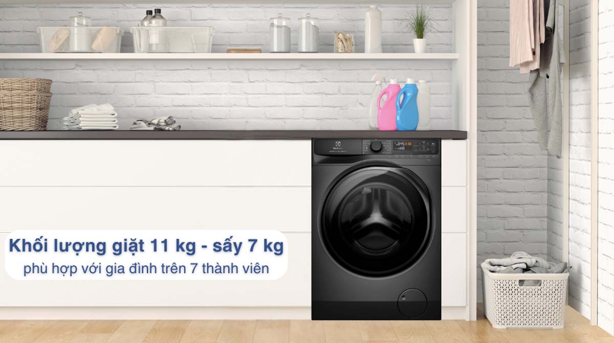 Máy có khả năng giặt lên đến 11 kg và sấy 7 kg quần áo, phù hợp cho gia đình có từ 5 đến 7 thành viên, giúp xử lý lượng lớn quần áo trong một lần giặt.