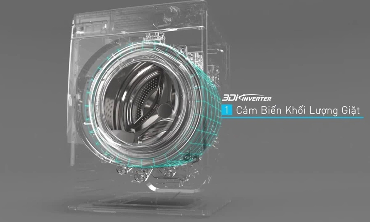 Động cơ Inverter điều khiển chuyển động lồng giặt theo ba chiều, giúp máy vận hành mạnh mẽ nhưng vẫn êm ái, tiết kiệm điện năng và nâng cao độ bền trong quá trình sử dụng lâu dài.