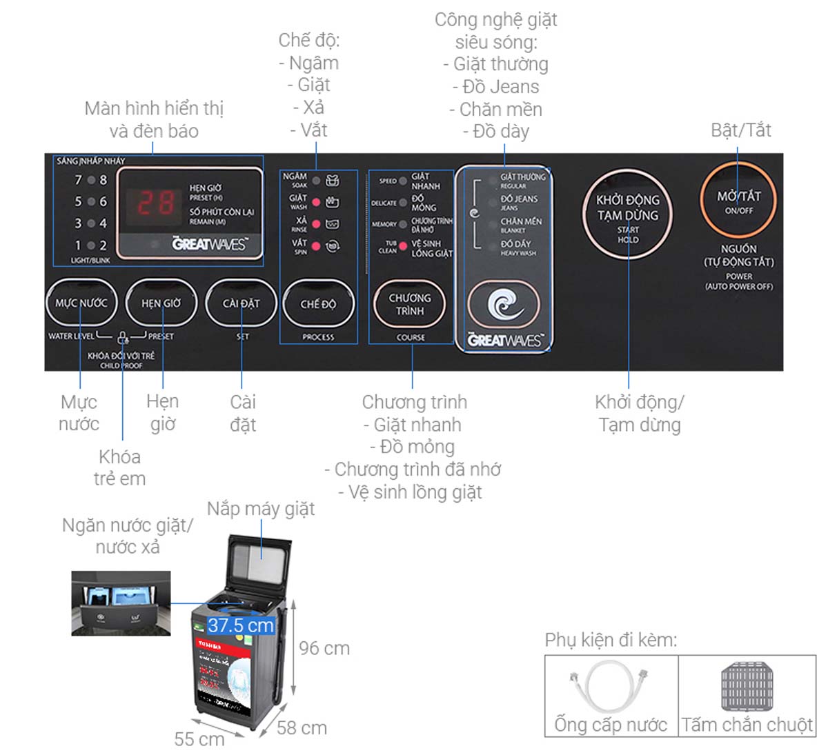 - Công nghệ giặt: Công nghệ GreatWaves kết hợp 3 luồng nước, lồng giặt ngôi sao pha lê, công nghệ I-Clean tự vệ sinh lồng giặt