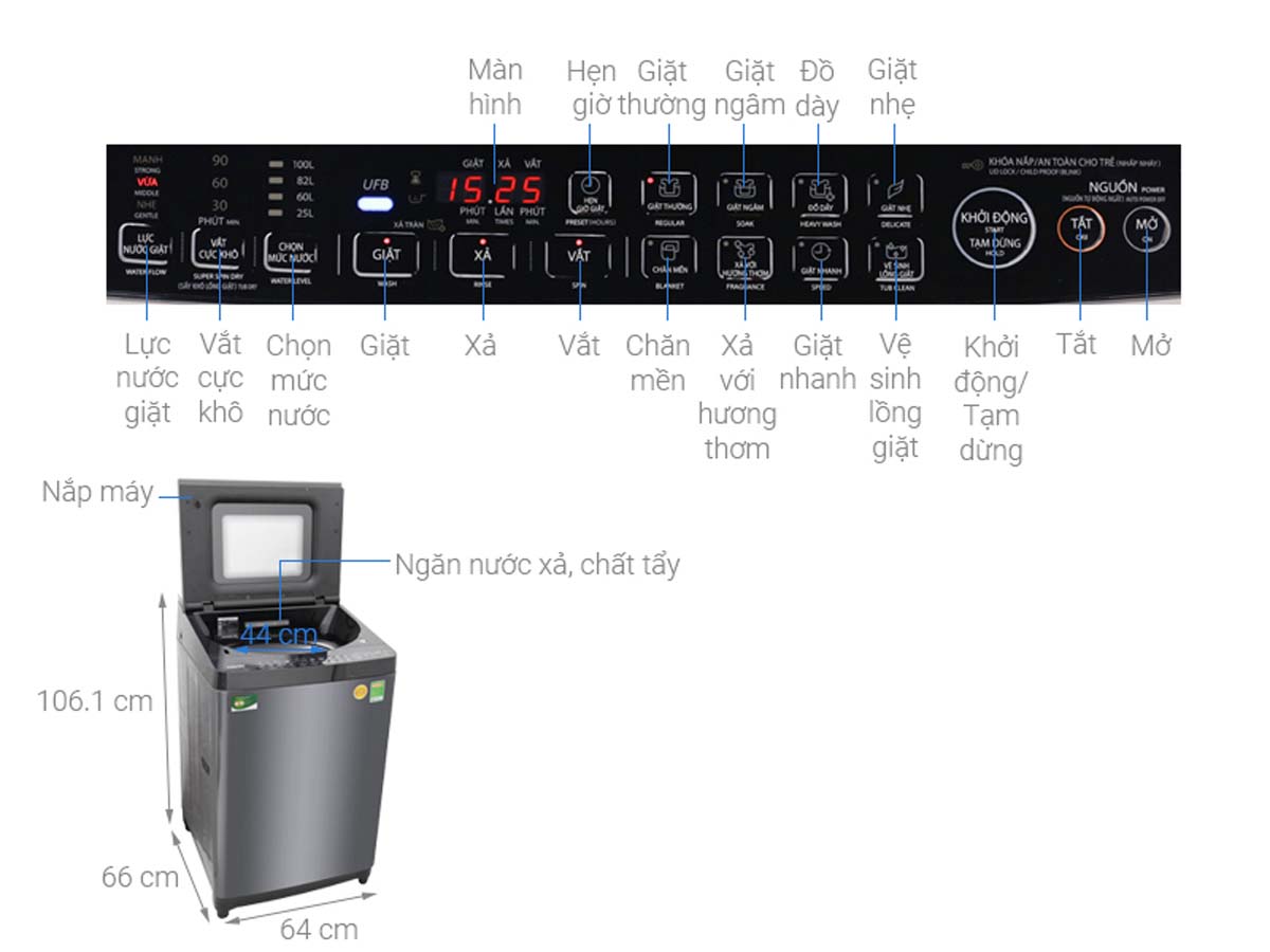 - Bảng điều khiển: Tiếng Việt, nút nhấn