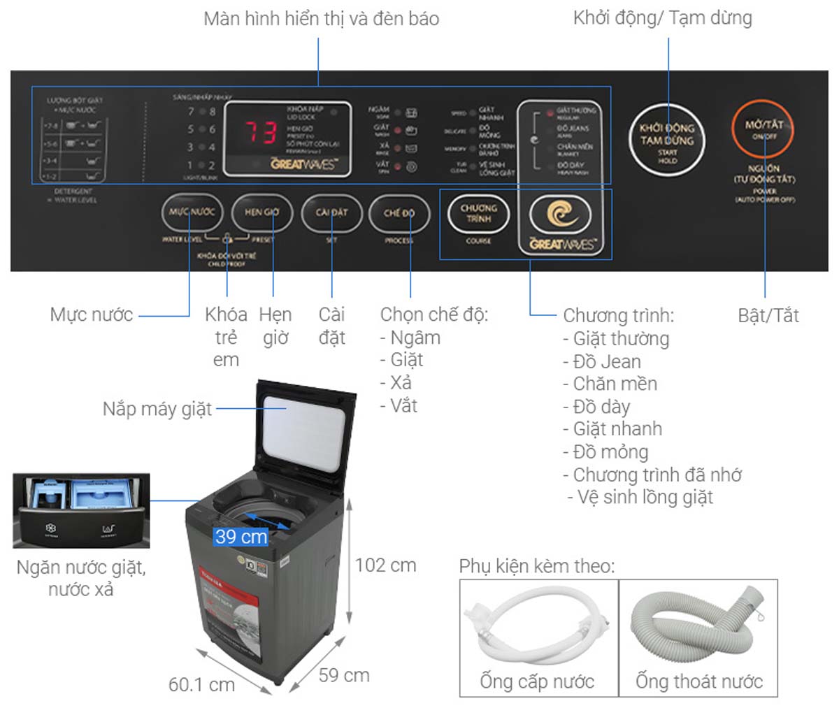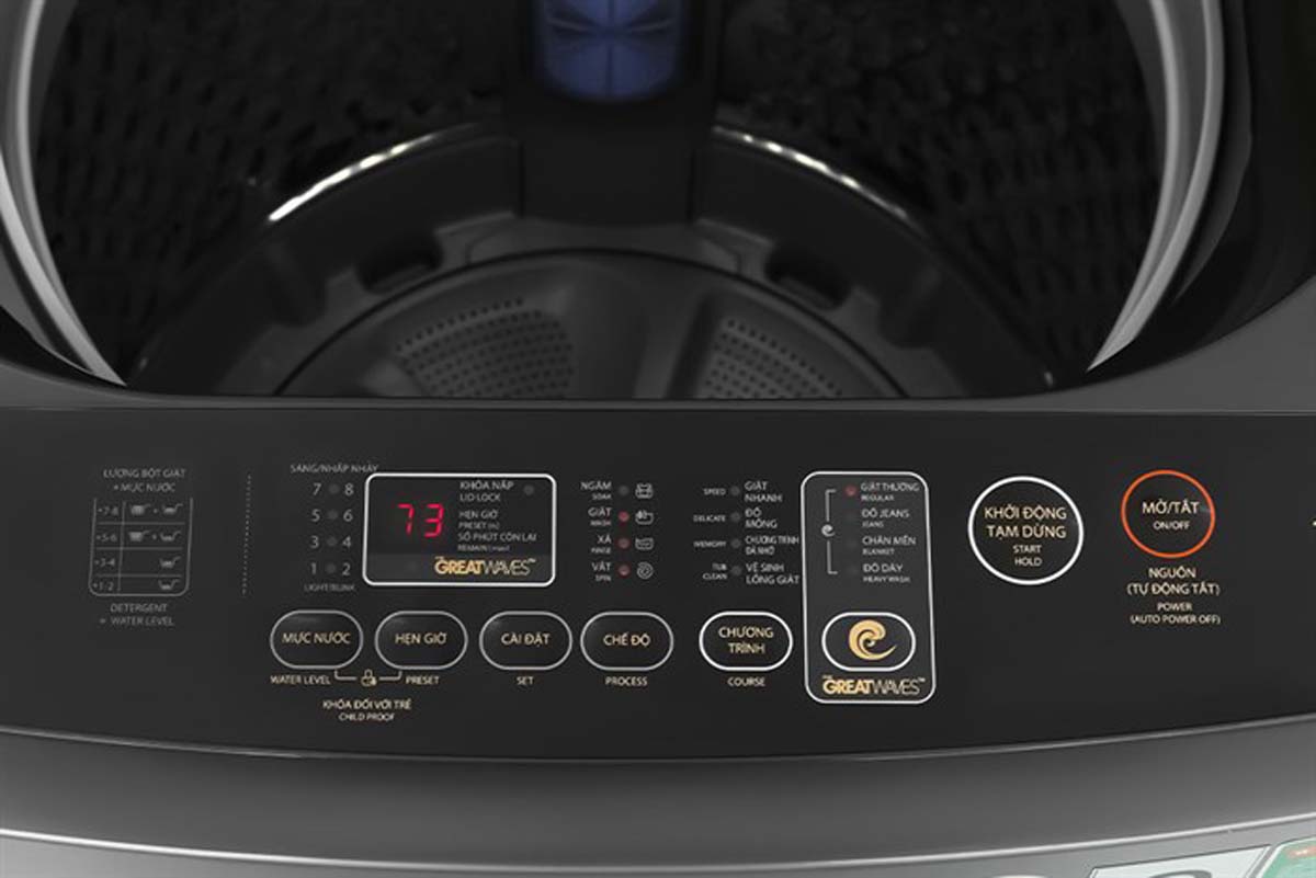 - Số chương trình giặt: 8 chương trình (Giặt thường, Chăn mền, Đồ dày, Giặt nhanh, Đồ mỏng, Chương trình đã nhớ, Vệ sinh lồng giặt, Đồ Jeans)