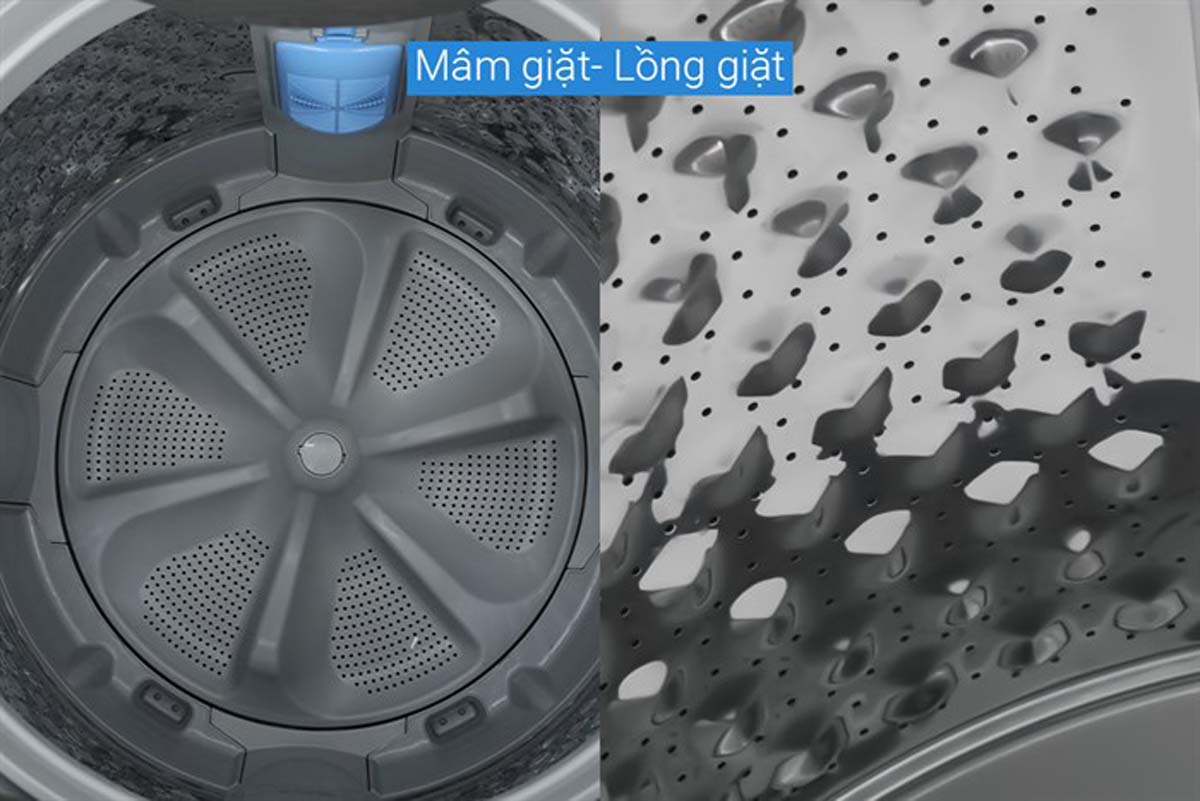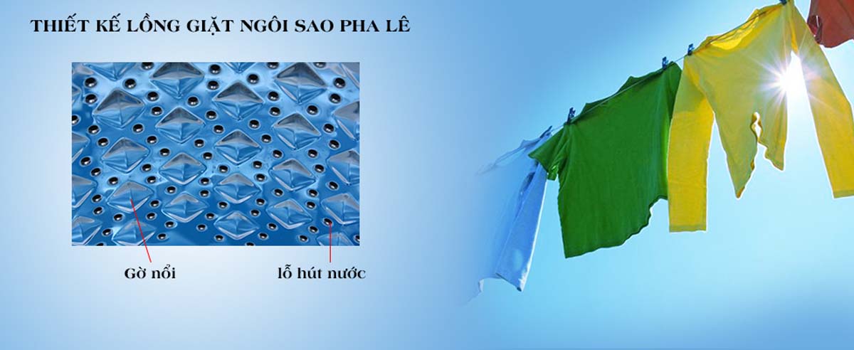 Lồng giặt được thiết kế với các gờ nổi hình ngôi sao pha lê và các lỗ thoát nước siêu nhỏ, tạo lực ma sát nhẹ nhàng nhưng hiệu quả trong việc đánh bật vết bẩn. Nhờ cấu trúc này, quần áo được giặt sạch mà không bị sờn rách, giữ được độ mềm mại và giúp lưu hương tốt hơn sau mỗi lần giặt.