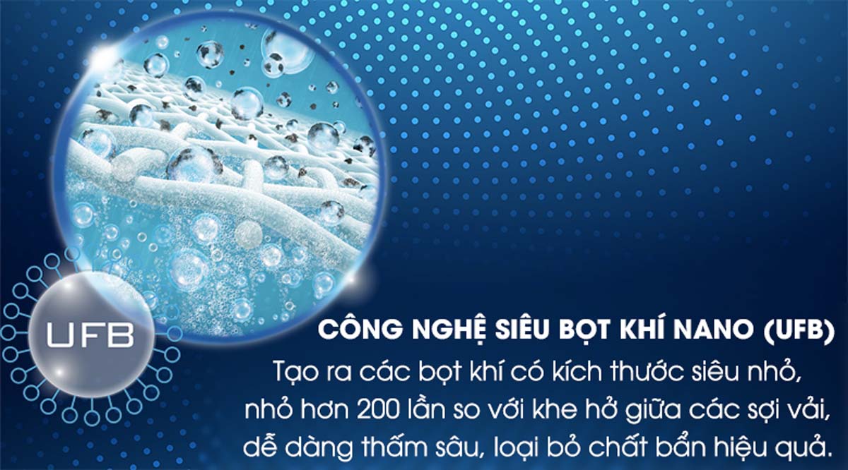 Công nghệ Ultra Fine Bubble (UFB) tạo ra các bọt khí nano siêu nhỏ, giúp chất giặt tẩy thẩm thấu sâu vào từng sợi vải, đánh bay vết bẩn cứng đầu mà không làm hư hại sợi vải. Bọt khí nano còn giúp làm mềm sợi vải và lưu giữ hương thơm lâu hơn sau mỗi lần giặt.