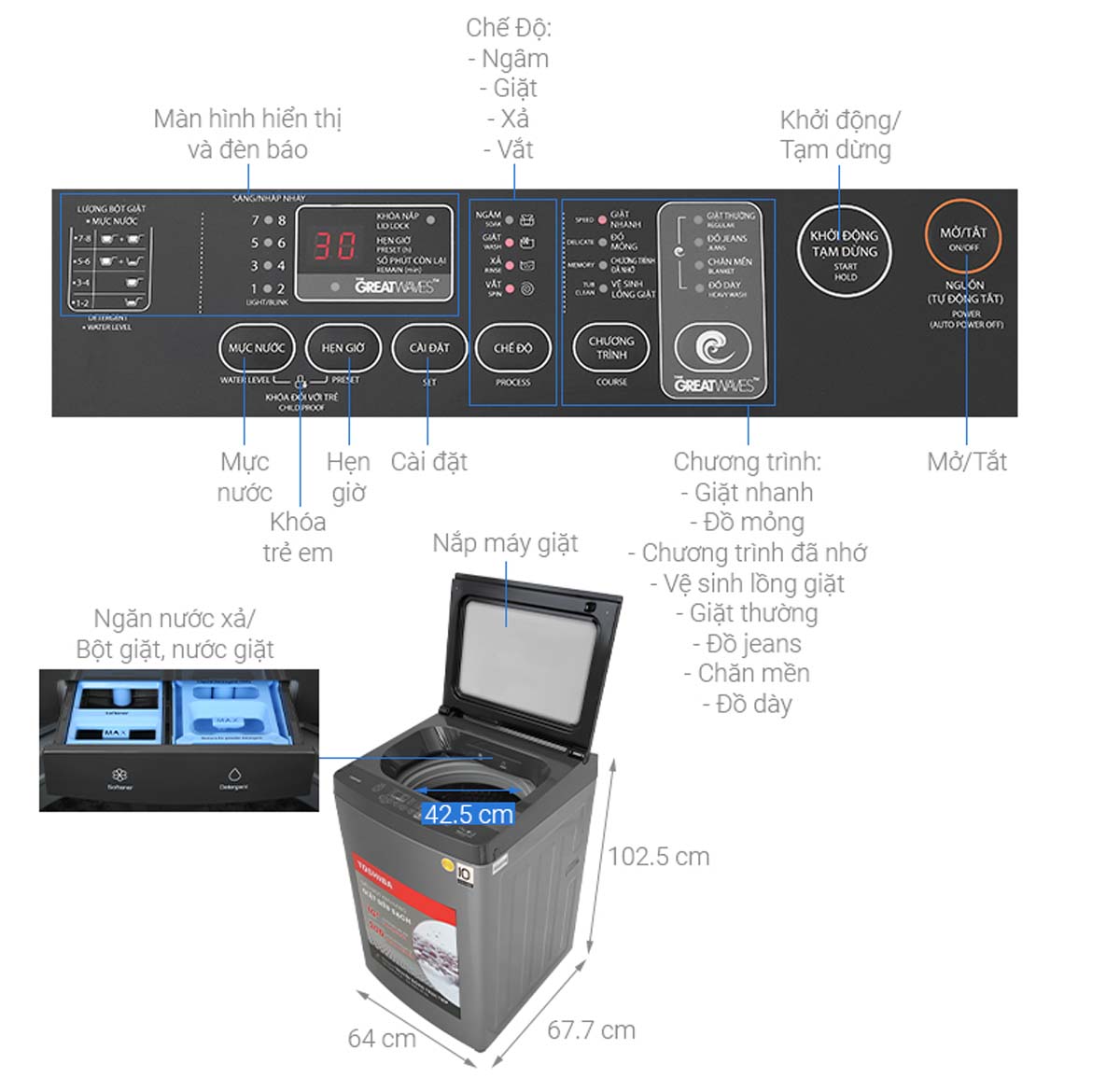 - Công nghệ giặt: Công nghệ siêu bọt khí Nano (UFB), GreatWaves kết hợp 3 luồng nước, lồng giặt ngôi sao pha lê, công nghệ suy luận ảo Fuzzy Logic