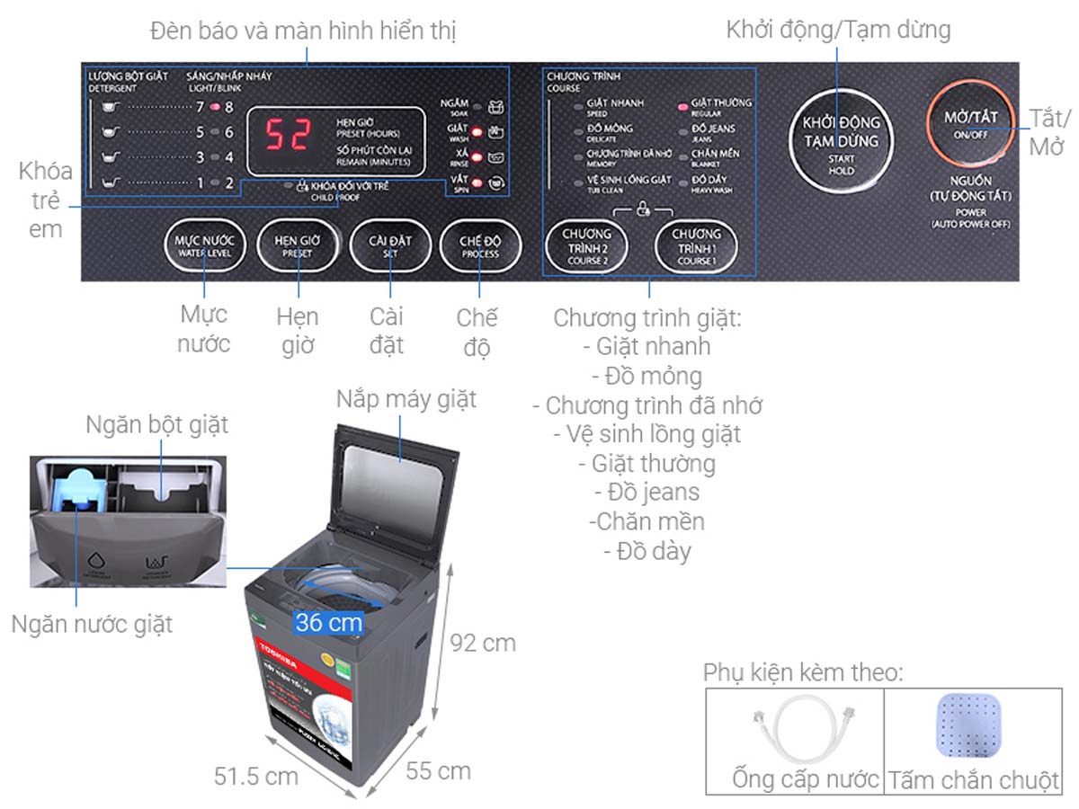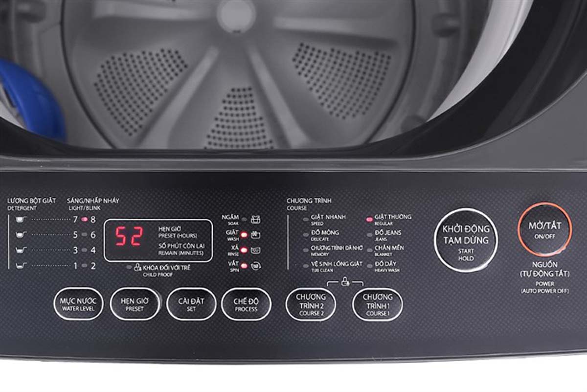 - Số chương trình giặt: 8 chương trình (Giặt thường, Giặt nhanh, Đồ mỏng, Đồ dày, Đồ Jeans, Chăn mền, Ghi nhớ chương trình giặt, Vệ sinh lồng giặt)