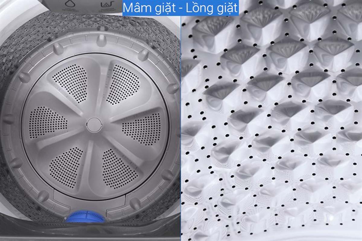 Mâm giặt được thiết kế với 864 lỗ nhỏ, tạo ra các tia nước phun ngược mạnh mẽ. Cơ chế này giúp nâng cao hiệu quả giặt sạch, đánh bật vết bẩn cứng đầu và ngăn quần áo tiếp xúc trực tiếp với mâm giặt, bảo vệ sợi vải.